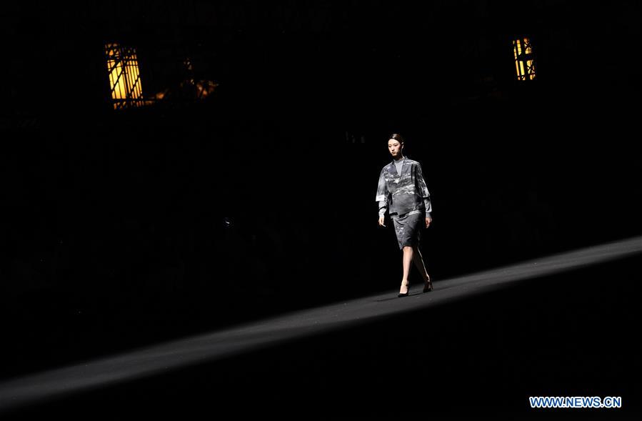 Un mannequin présente une création lors de la cérémonie d'ouverture de la Semaine de la mode de Xi'an, à Xi'an, capitale de la province du Shaanxi (nord-ouest de la Chine), le 18 avril 2019. Cette semaine de la mode durera jusqu'au le 23 avril. (Xinhua/Liu Xiao)