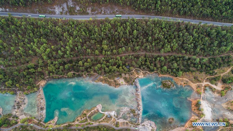 Photo aérienne prise le 21 avril 2019 montrant le paysage de la Vallée de la Lune Bleue à Lijiang, dans la province du Yunnan (sud-ouest de la Chine). (Xinhua/Zi Qiang)