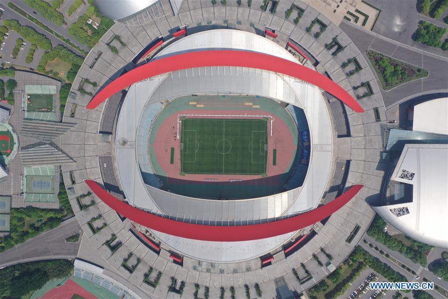 Photo aérienne prise le 19 avril 2019 montrant la vue d'un stade dans le Centre olympique de Nanjing à Nanjing, capitale de la province chinoise du Jiangsu (est). (Xinhua/Li Bo)