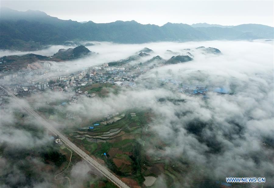 Photo aérienne prise le 25 avril 2019 montrant un brouillard d'advection dans le district de Danzhai, dans la province du Guizhou (sud-ouest de la Chine). (Xinhua/Yang Wenbin)