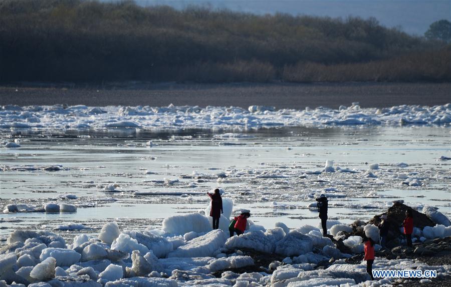 Des touristes prennent des photos de la fonte des glaces dans la section Huma de la rivière Heilongjiang dans la province du Heilongjiang (nord-est de la Chine), le 3 mai 2019. (Xinhua/Zhou Changping)