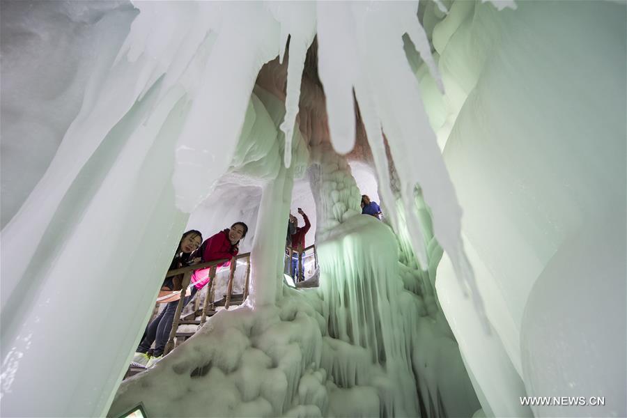 Des touristes visitent une grotte de glace dans le site pittoresque de Luyashan au district de Ningwu à Xinzhou, dans la province chinoise du Shanxi (nord), le 4 mai 2019. Selon les recherches, la grotte de glace de 100 mètres de profondeur, s'est formée il y a 3 millions d'années. (Xinhua/Cao Jianguo)