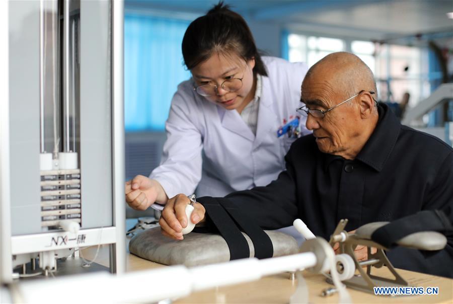 HENGSHUI, 6 mai (Xinhua) -- Un homme est aidé par le personnel médical durant une session de rééducation, dans un centre de soins aux personnes âgées de Hengshui, dans la province du Hebei (nord de la Chine), le 5 mai 2019. (Photo : Mu Yu)