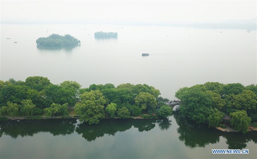 Photo aérienne prise le 10 mai 2019 montrant le paysage du lac de l'Ouest à Hangzhou, dans la province du Zhejiang (est de la Chine). (Xinhua/Weng Xinyang)