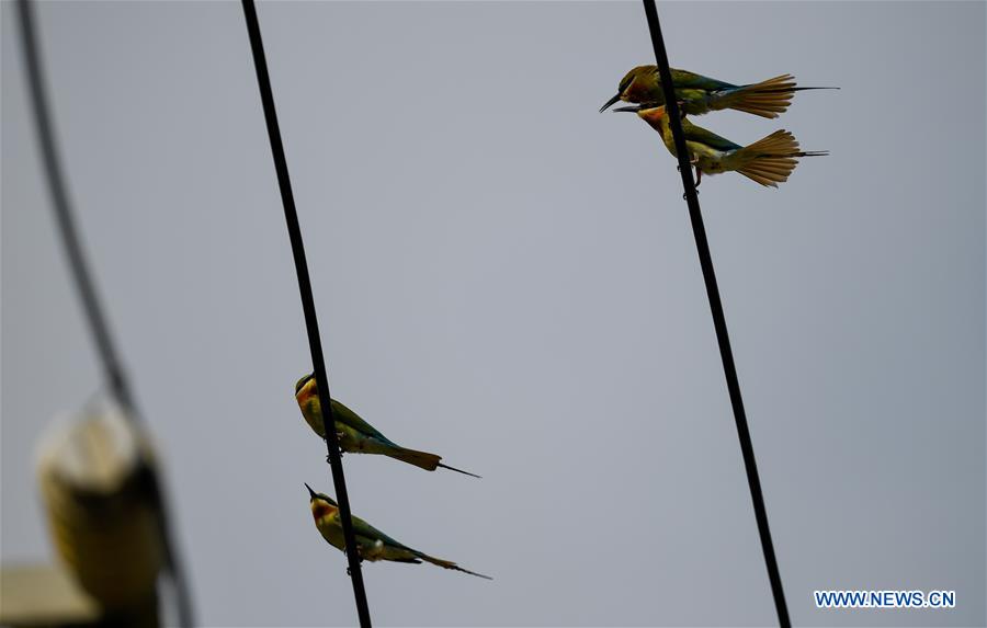 Photo prise le 14 mai 2019 montrant des guêpiers à queue d'azur à Haikou, dans la province de Hainan (sud de la Chine). (Xinhua/Yang Guanyu)