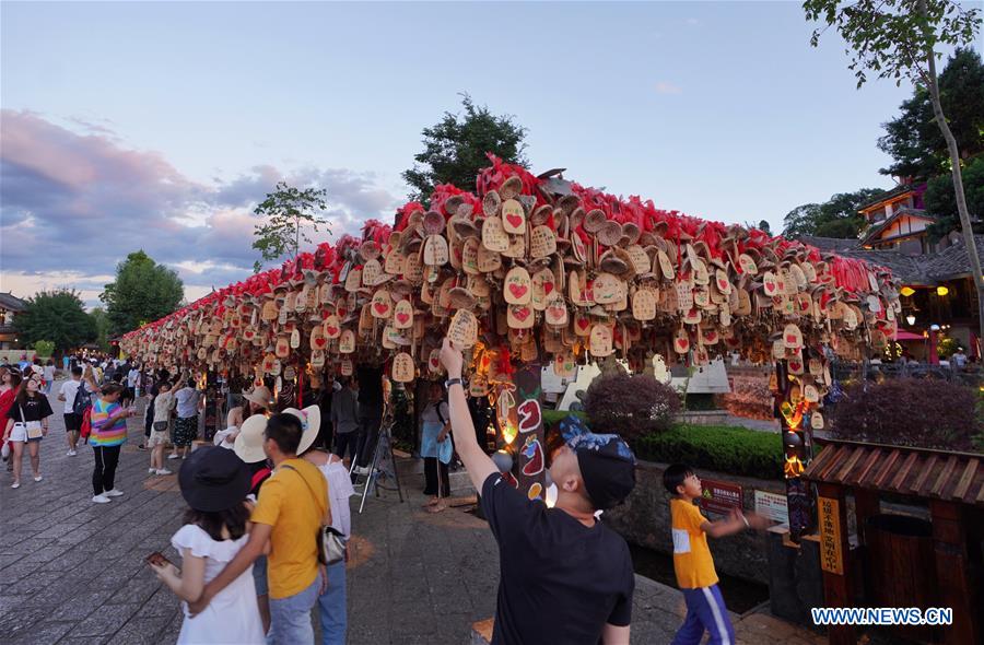 Des touristes visitent la vieille ville de Lijiang dans la province du Yunnan (sud-ouest de la Chine), le 6 juin 2019. La vieille ville de Lijiang a été inscrite en 1997 sur la liste du patrimoine mondial de l'UNESCO. (Xinhua/Qin Qing)