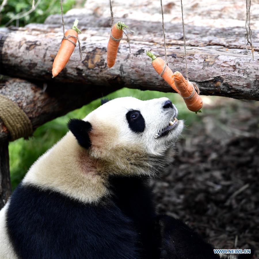 Un panda géant mange des carottes dans la maison du panda géant au Zoo d'animaux sauvage du plateau Qinghai-Tibet à Xining, capitale de la province du Qinghai (nord-ouest de la Chine), le 16 juin 2019. La maison du panda géant au Zoo d'animaux sauvage du plateau Qinghai-Tibet, où vivent quatre pandas géants venus de la Base de recherche de l'élevage de pandas géants de Chengdu, a ouvert ses portes dimanche au public. (Xinhua/Zhang Long)
