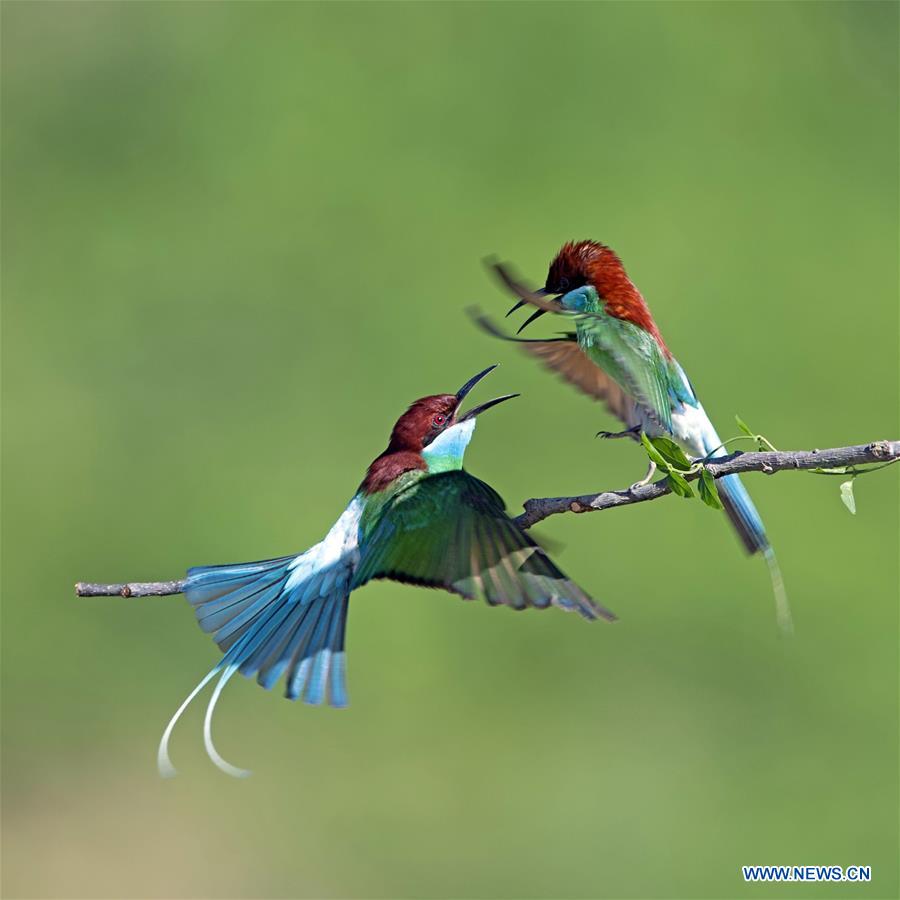 Deux guêpiers à gorge bleue sont vus au village de Xiexi du bourg de Luxia à Nanping, dans la province chinoise du Fujian (sud-est), le 15 juin 2019. (Xinhua/Mei Yongcun)