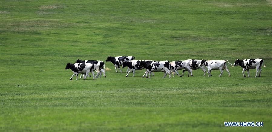 Photo prise le 26 juin 2019 montrant des vaches au pâturage Sanhuan à Dalian, dans la province du Liaoning (nord-est de la Chine). (Xinhua/Yao Jianfeng)