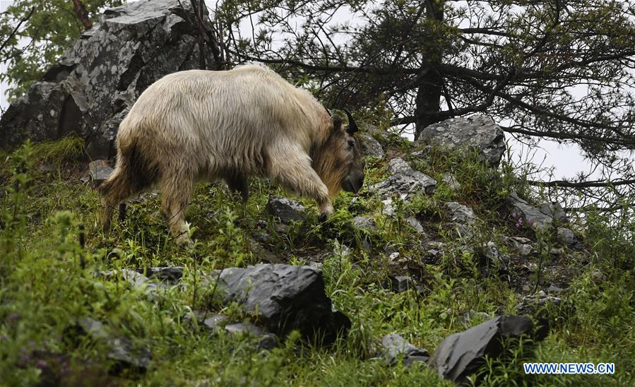 Photo prise le 27 juin 2019 montrant un takin aux monts Qinling, dans la province du Shaanxi (nord-ouest de la Chine). (Xinhua/Tao Ming)