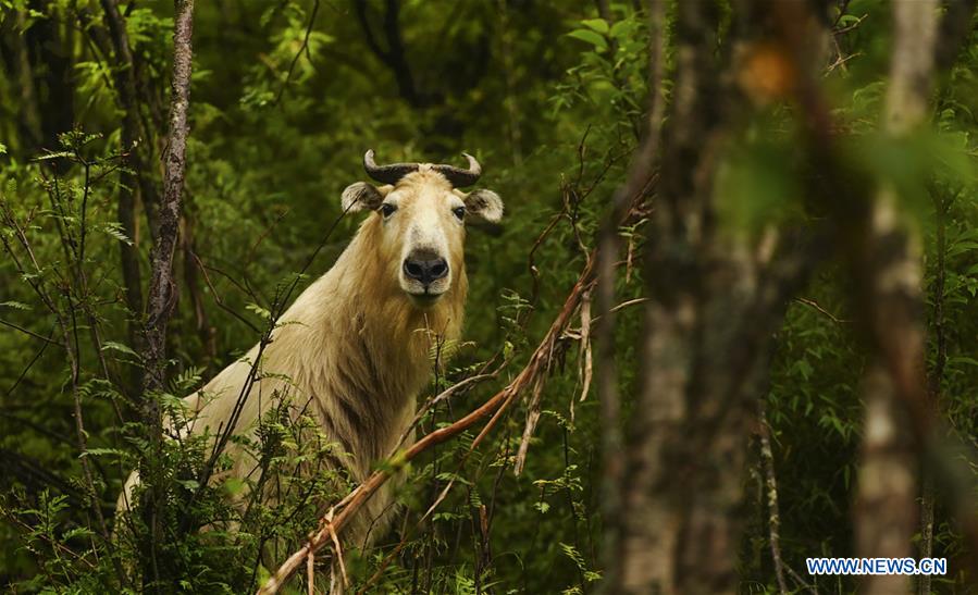 Photo prise le 26 juin 2019 montrant un takin aux monts Qinling, dans la province du Shaanxi (nord-ouest de la Chine). (Xinhua/Jiao Rongchao)