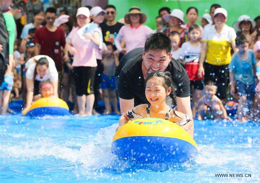 Des enfants jouent dans l'eau avec leurs parents dans le district de Longhui à Shaoyang, ville de la province du Hunan (centre de la Chine), le 28 juin 2019. (Xinhua/Zeng Yong)