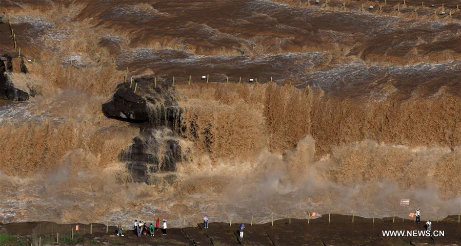 Des gens admirent le paysage du site pittoresque de la cascade Hukou dans la province du Shanxi (nord de la Chine), le 30 juin 2019. (Xinhua/Lyu Guiming)