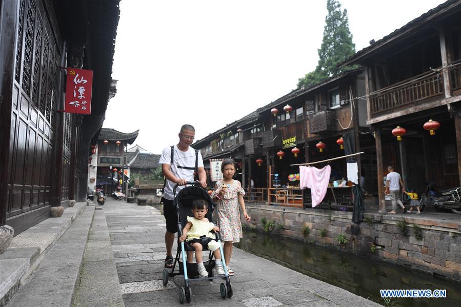 DEQING, 5 juillet (Xinhua) -- Des touristes visitent le vieux bourg de Xinshi, dans le district de Deqing de la province chinoise du Zhejiang (est), le 4 juillet 2019. (Photo : Xu Qin)