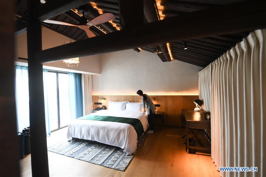 DEQING, 5 juillet (Xinhua) -- Une employée nettoie une chambre d'hôtel dans le vieux bourg de Xinshi du district de Deqing, dans la province chinoise du Zhejiang (est), le 4 juillet 2019. (Photo : Li Jianan)