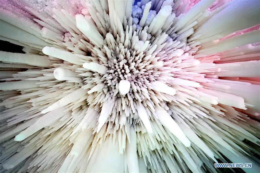 Photo prise le 5 juillet 2019 montrant l'intérieur de la grotte de glace N° 1 dans la montagne de Yunqiu, dans le district de Xiangning de la province chinoise du Shanxi (nord). (Xinhua/Zhan Yan)