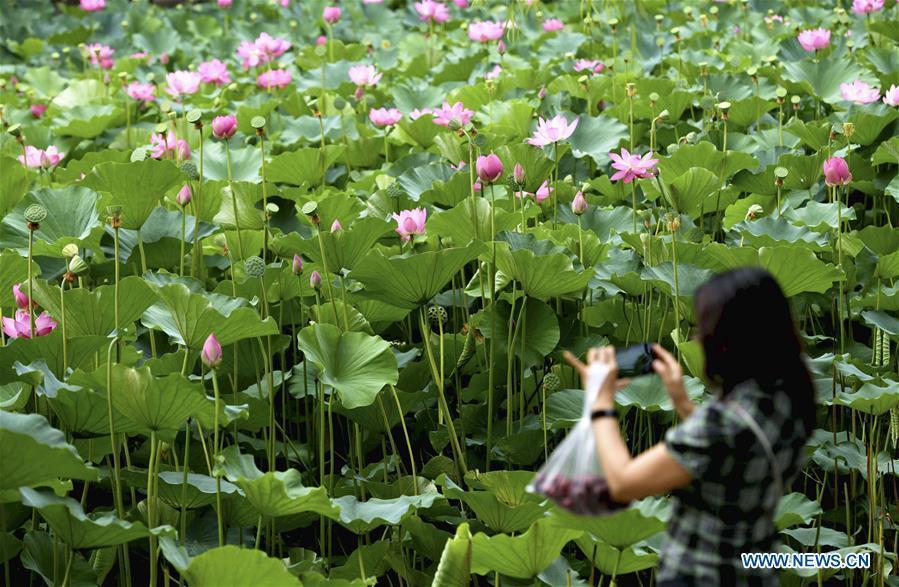 Une femme prend des photos de fleurs de lotus dans un parc du district de Qiaoxi à Shijiazhuang, dans la province du Hebei (nord de la Chine), le 7 juillet 2019 . (Xinhua/Chen Qibao)