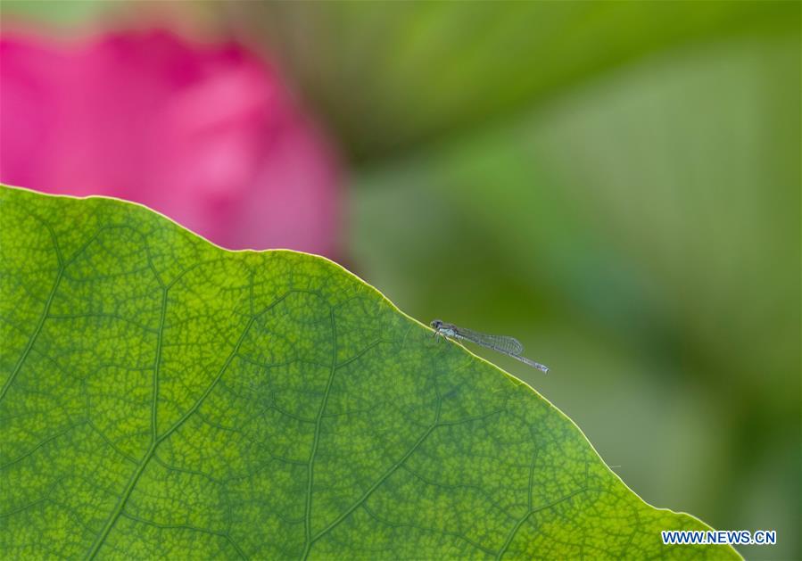 Photo prise le 7 juillet 2019 montrant une libellule sur une feuille de lotus dans un parc à Wuhu, dans la province de l'Anhui (est de la Chine). (Xinhua/Shui Congze)