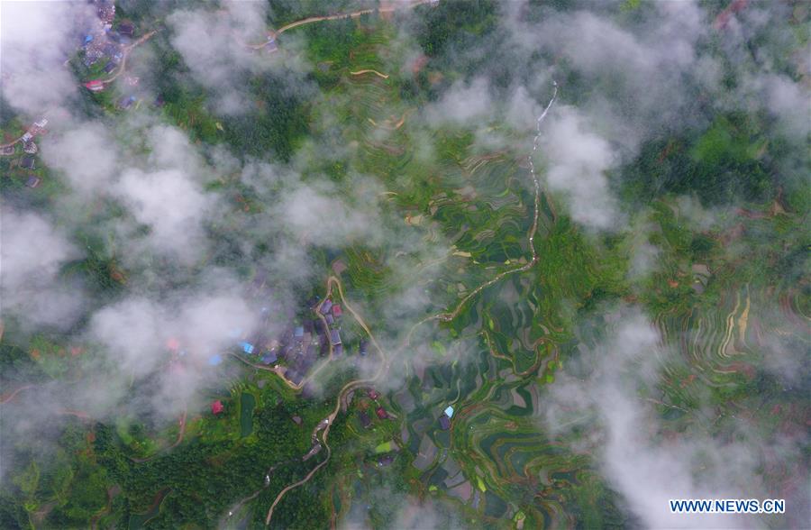 Photo aérienne prise le 7 juillet 2019 montrant le paysage du village de l'ethnie Miao de Kongmen, dans le district autonome Miao de Rongshui de la région autonome Zhuang du Guangxi (sud de la Chine). (Xinhua/Huang Xiaobang)