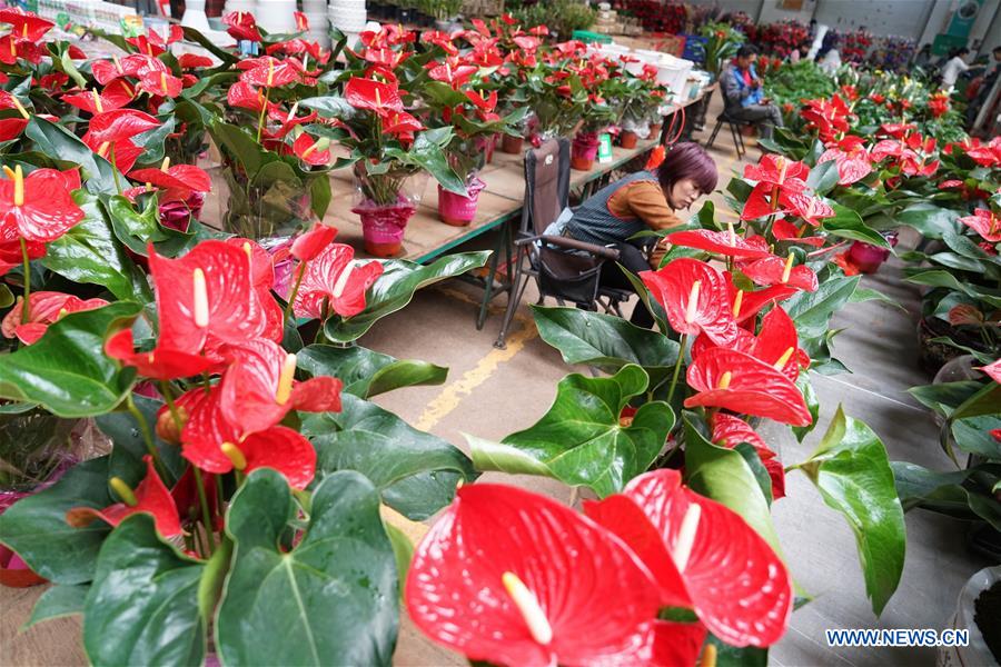 Une vendeuse range des fleurs dans le marché aux fleurs de Dounan à Kunming, capitale de la province du Yunnan (sud-ouest de la Chine), le 9 juillet 2019. (Xinhua/Qin Qing)