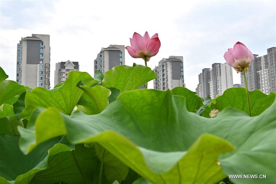 Photo prise le 9 juillet 2019 montrant des fleurs de lotus dans le parc Jinshan à Fuzhou, capitale de la province du Fujian (sud-est de la Chine). (Xinhua/Jiang Kehong)