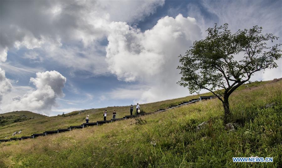 Des touristes admirent le paysage de la zone pittoresque du mont Zibai dans le district de Liuba à Hanzhong, ville dans la province du Shaanxi (nord-ouest de la Chine), le 12 juillet 2019. (Xinhua/Tao Ming)