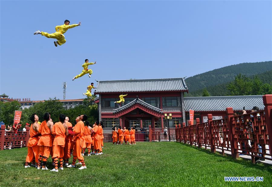 ZHENGZHOU, 14 juillet (Xinhua) -- Spectacle d'arts martiaux dans la zone touristique du temple Shaolin sur le mont Song, dans la province chinoise du Henan (centre), le 13 juillet 2019. (Photo : Li Jianan)