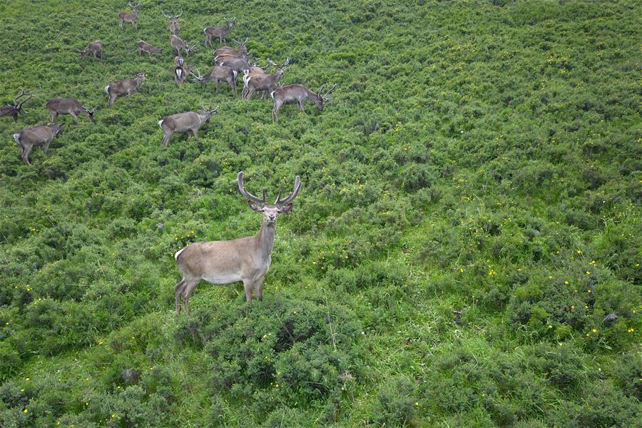 ZHANGYE, Gansu, 22 juillet (Xinhua) -- Des cerfs communs dans une prairie à Zhangye, dans la province chinoise du Gansu (nord-ouest), le 20 juillet 2019. (Photo : Fan Peishen)
