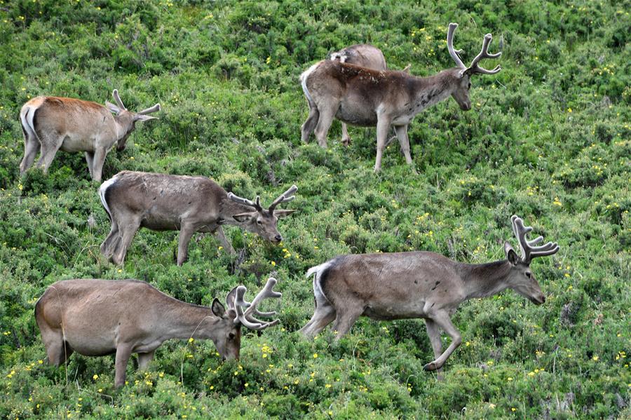 ZHANGYE, Gansu, 22 juillet (Xinhua) -- Des cerfs communs dans une prairie à Zhangye, dans la province chinoise du Gansu (nord-ouest), le 20 juillet 2019. (Photo : Fan Peishen)
