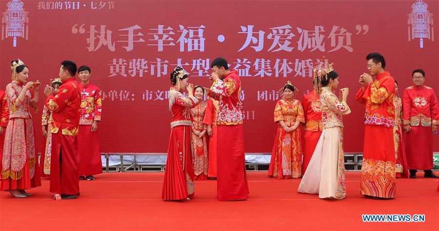 Des couples participent à une cérémonie de mariage collectif au Parc Nanhai à Huanghua, dans la province du Hebei (nord de la Chine), le 6 août 2019. (Xinhua/Zhu Xudong)
