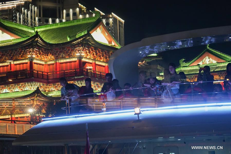 Des touristes admirent la vue nocturne sur un bateau de croisière à Nanchang, capitale de la province du Jiangxi (est de la Chine), le 6 août 2019. (Xinhua/Wan Xiang)