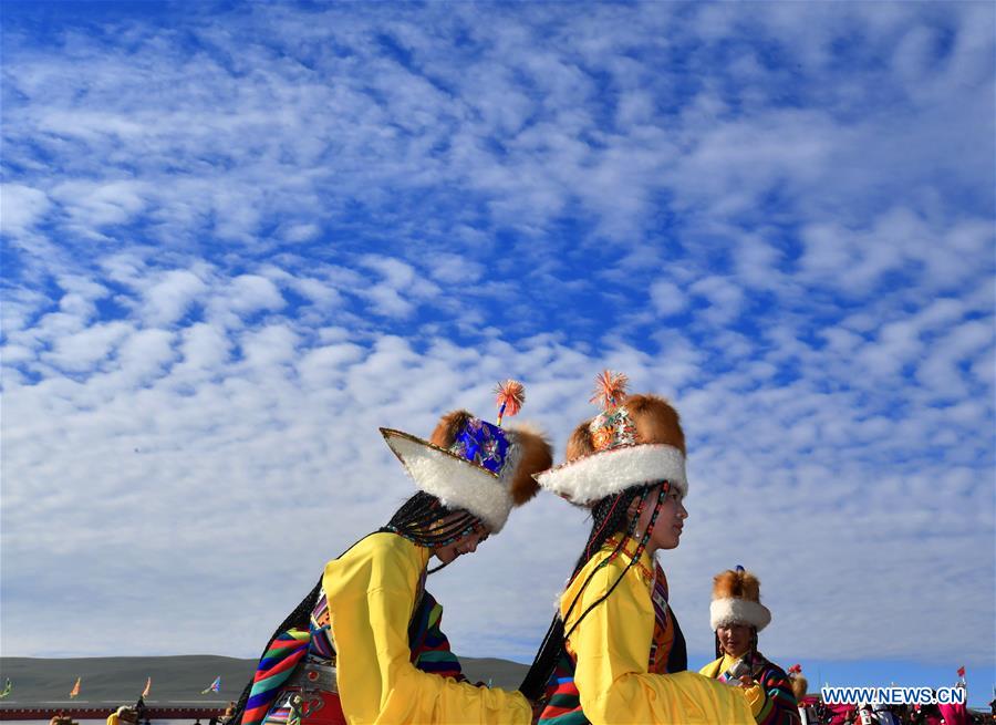 LHASSA, 13 août (Xinhua) -- Des personnes portent des chapeaux lors d'un festival de courses de chevaux à Nagqu, ville de la région autonome du Tibet, dans le sud-ouest de la Chine, le 10 août 2019. Les habitants du district d'Amdo de la ville de Nagqu ont pour tradition de porter des chapeaux, qui sont maintenant principalement fabriqués à partir de peaux d'agneau et de cuir artificiel. Le chapeau a généralement une bande de tissu semblable à une antenne sur le dessus. (Photo : Chogo)