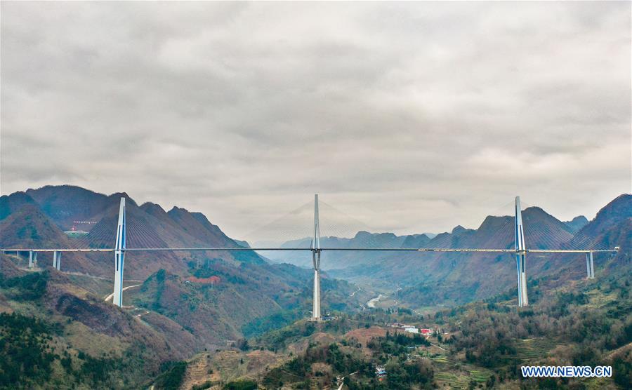 Photo prise le 29 décembre 2019 montrant la vue du pont Pingtang dans la province du Guizhou (sud-ouest de la Chine). (Xinhua/Liu Xu)
