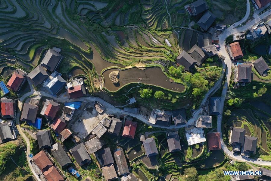 Paysage printanier du village de l'ethnie Miao de Gaoyu dans le district autonome Miao de Rongshui, dans la région autonome Zhuang du Guangxi (sud de la Chine), le 31 mars 2020. (Xinhua/Huang Xiaobang)
