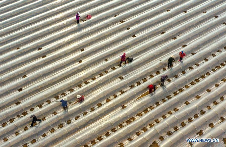 SHIJIAZHUANG,19 avril (Xinhua) -- Une photo aérienne prise le 18 avril 2020 montre des agriculteurs qui travaillent dans un champs dans l'arrondissement de Luancheng à Shijiazhuang, dans la province chinoise du Hubei (nord). Guyu, qui signifie littéralement "Pluie de millet", est la sixième des 24 périodes solaires créées par les anciens Chinois pour mener les activités agricoles. Guyu tombe cette année le 19 avril. (Photo : Li Mingfa)