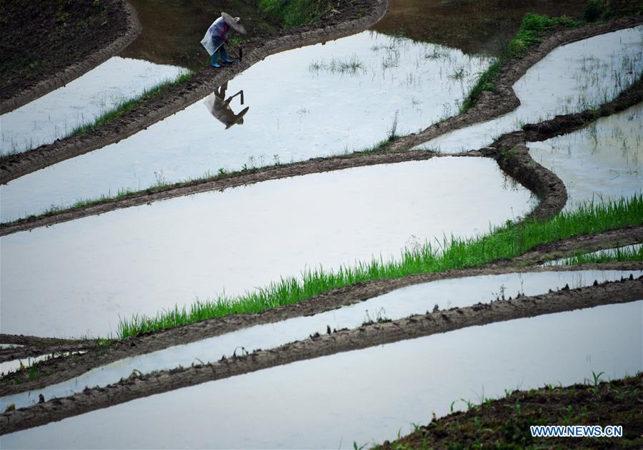 ENSHI,19 avril (Xinhua) -- Un agriculteur travaille dans un champ dans le village de Bandahu du bourg de Shadaogou, dans le district de Xuan'en, dans la province du Hubei (centre), le 18 avril 2020. Guyu, qui signifie littéralement "Pluie de millet", est la sixième des 24 périodes solaires créées par les anciens Chinois pour mener les activités agricoles. Guyu tombe cette année le 19 avril. (Photo : Wang Jun)