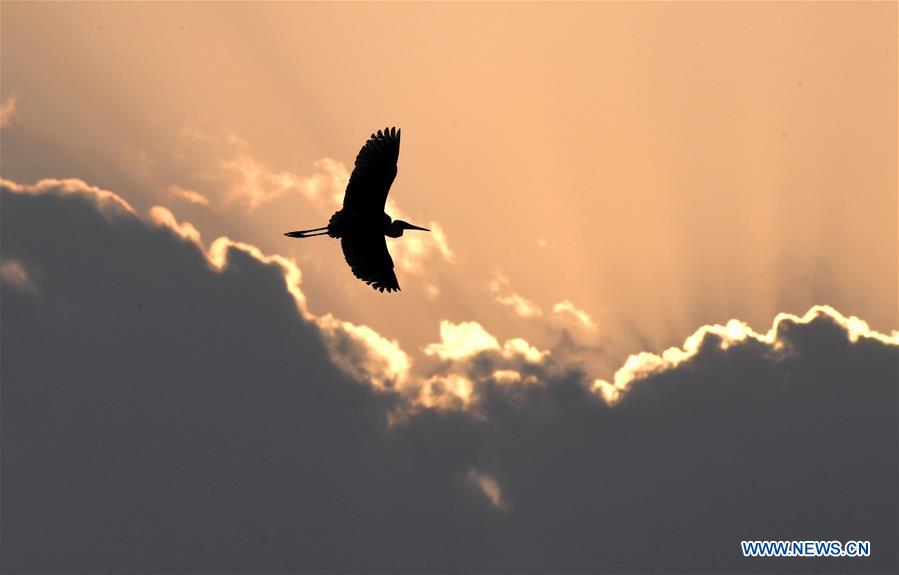 Une aigrette volent au-dessus d'un parc forestier au moment du coucher du soleil à Nanchang, dans la province chinoise du Jiangxi (est), le 27 avril 2020. (Xinhua/Wan Xiang)