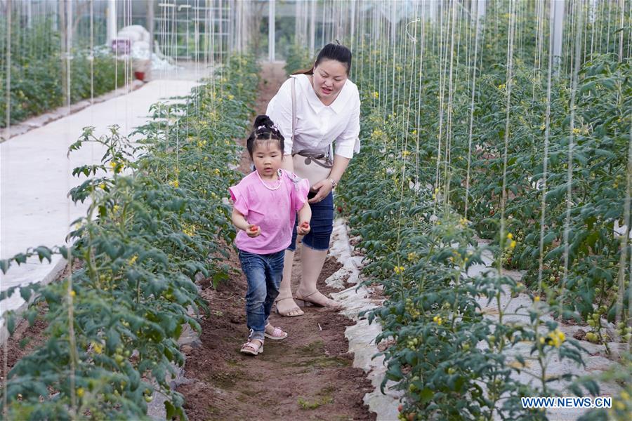 CHONGQING, 5 mai (Xinhua) -- Une femme et sa fille récoltent des tomates cerise dans une ferme intelligente dans l'arrondissement de Liangping à Chongqing, dans le sud-ouest de la Chine, le 4 mai 2020. La ferme, qui dispose de technologies agricoles modernes et intègre les expériences interactives de l'agriculture moderne, a attiré de nombreux visiteurs lors de la fête du Travail. (Photo : Liu Chan)