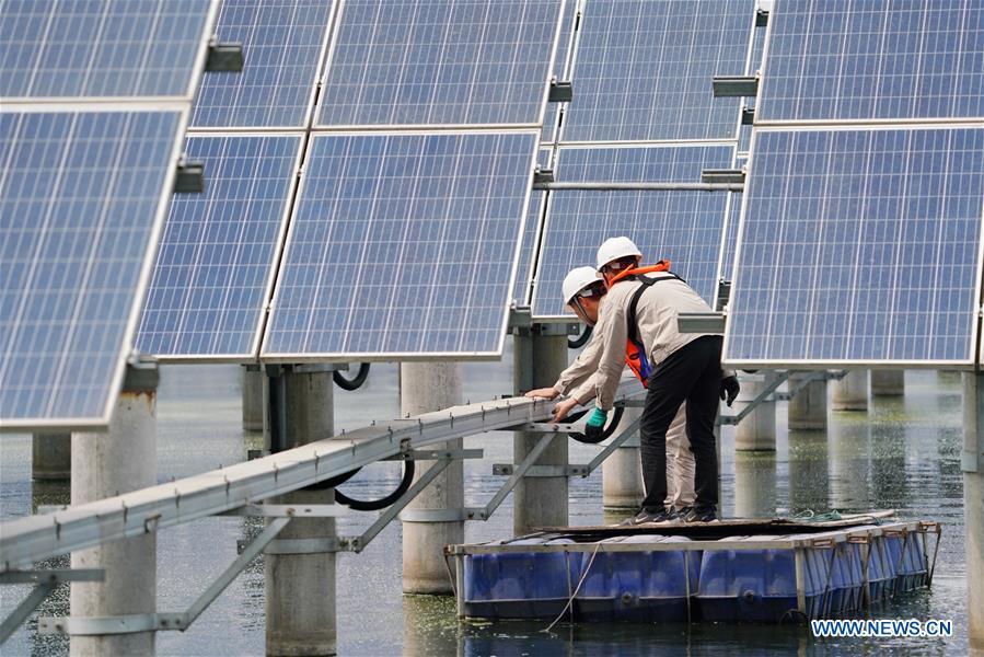 TANGSHAN, 15 juin (Xinhua) -- Des ouvriers examinent les installations photovoltaïques dans une ferme aquatique dans l'arrondissement de Fengnan à Tangshan, dans la province chinoise du Hebei, le 14 juin 2020. La ferme aquatique moderne est conçue pour élever des poissons et générer en même temps de l'électricité avec des panneaux photovoltaïques à sa surface. (Photo : Mu Yu)