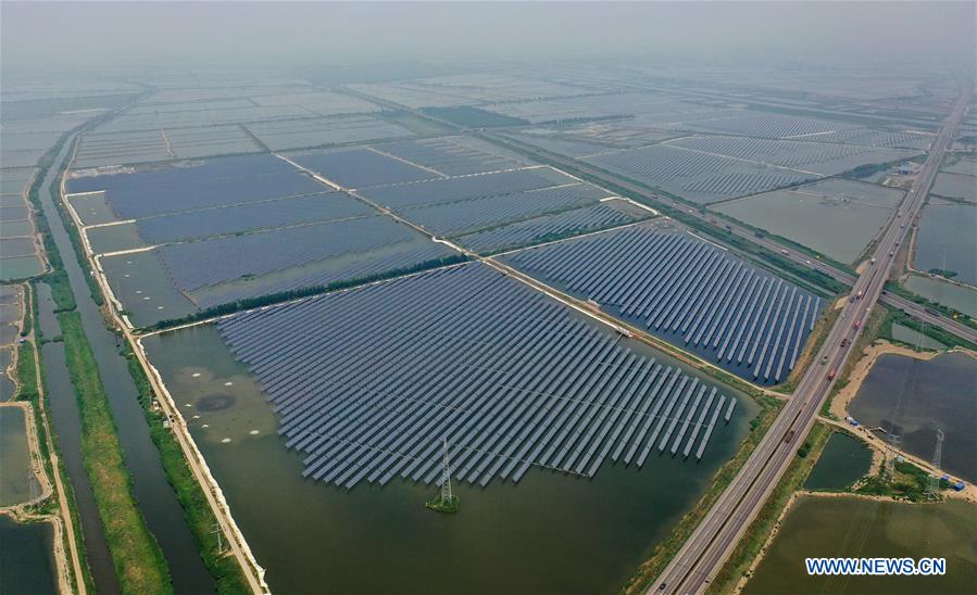 TANGSHAN, 15 juin (Xinhua) -- La première phase d'un projet de ferme aquatique moderne dans l'arrondissement de Fengnan à Tangshan, dans la province chinoise du Hebei, le 14 juin 2020. La ferme aquatique moderne est conçue pour élever des poissons et générer en même temps de l'électricité avec des panneaux photovoltaïques à sa surface. (Photo : Mu Yu)