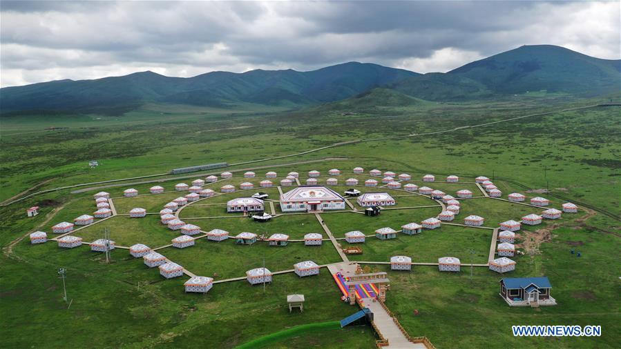 LUQU, 21 juin (Xinhua) -- Photo aérienne prise le 20 juin 2020 montrant le panorama d'un site touristique, dans le village de Gaxiu, à Luqu, district de la préfecture autonome tibétaine de Gannan, dans la province chinoise du Gansu (nord-ouest). Ces dernières années, le village de Gaxiu a développé l'industrie de la culture et du tourisme en vue d'augmenter les revenus de la population locale, tout en conservant les caractéristiques rurales originales et en mettant en valeur les particularités tibétaines. (Photo : Chen Bin)