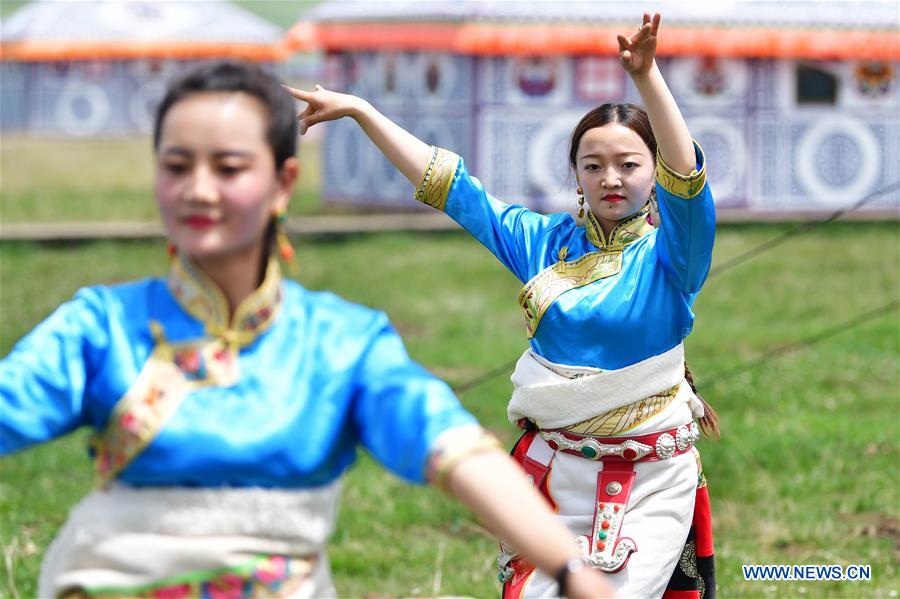 LUQU, 21 juin (Xinhua) -- Des villageoises dansent dans un site touristique, dans le village de Gaxiu, à Luqu, district de la préfecture autonome tibétaine de Gannan, dans la province chinoise du Gansu (nord-ouest), le 20 juin 2020. Ces dernières années, le village de Gaxiu a développé l'industrie de la culture et du tourisme en vue d'augmenter les revenus de la population locale, tout en conservant les caractéristiques rurales originales et en mettant en valeur les particularités tibétaines. (Photo : Chen Bin)