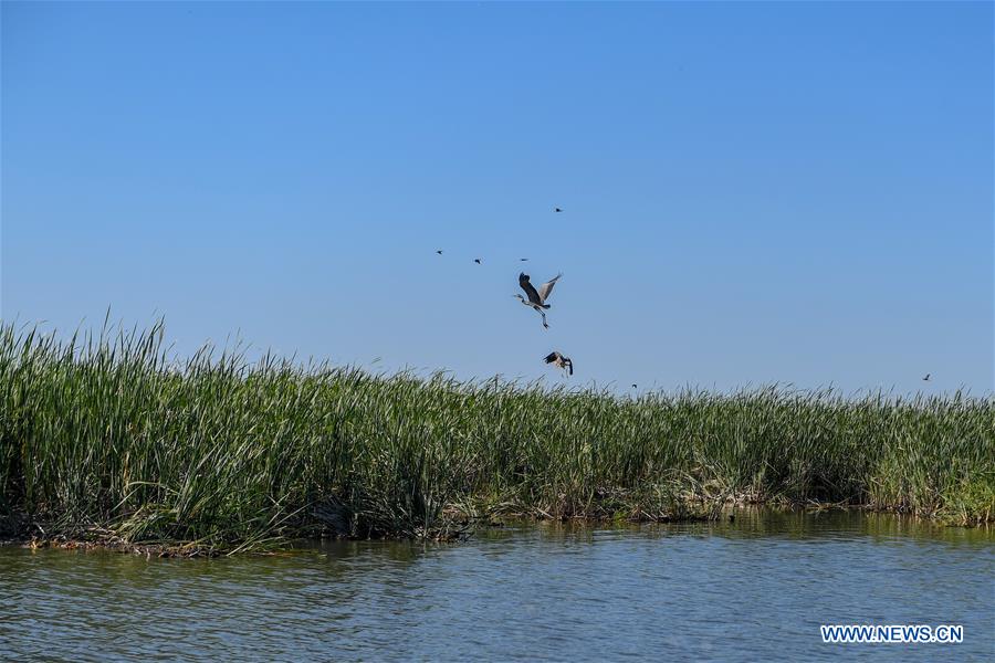 Des oiseaux volent au-dessus du lac Chagan à Songyuan, dans la province chinoise du Jilin (nord-est), le 20 juillet 2020. (Xinhua/Zhang Nan)