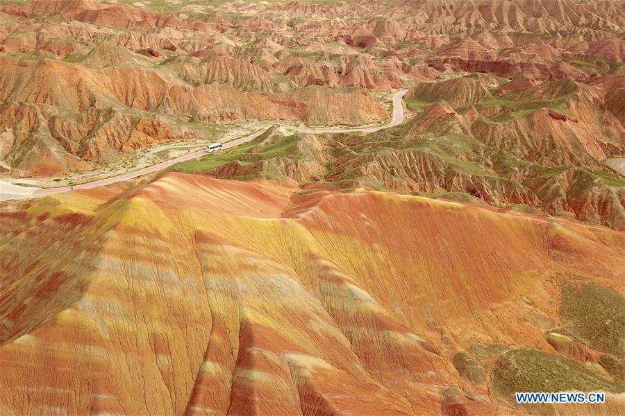Photo aérienne prise le 27 juillet 2020 montrant le paysage de relief Danxia dans le parc géologique national Danxia à Zhangye, dans la province du Gansu (nord-ouest de la Chine). (Xinhua/Fan Peishen)