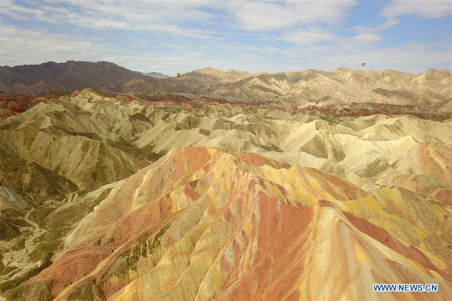 Photo aérienne prise le 27 juillet 2020 montrant le paysage de relief Danxia dans le parc géologique national Danxia à Zhangye, dans la province du Gansu (nord-ouest de la Chine). (Xinhua/Fan Peishen)