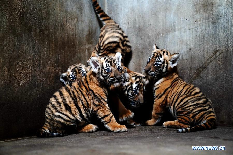 Quatre bébés tigres de Chine méridionale au Zoo de Shanghai, dans l'est de la Chine, le 28 août 2020. Le zoo a lancé une campagne de dénomination auprès du public pour nommer les quatre petits tigres femelles qui sont nés le 4 juillet 2020. (Xinhua/Zhang Jiansong)