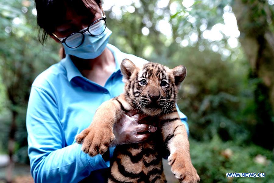Un bébé tigre de Chine méridionale au Zoo de Shanghai, dans l'est de la Chine, le 28 août 2020. Le zoo a lancé une campagne de dénomination auprès du public pour nommer les quatre petits tigres femelles qui sont nés le 4 juillet 2020. (Xinhua/Zhang Jiansong)