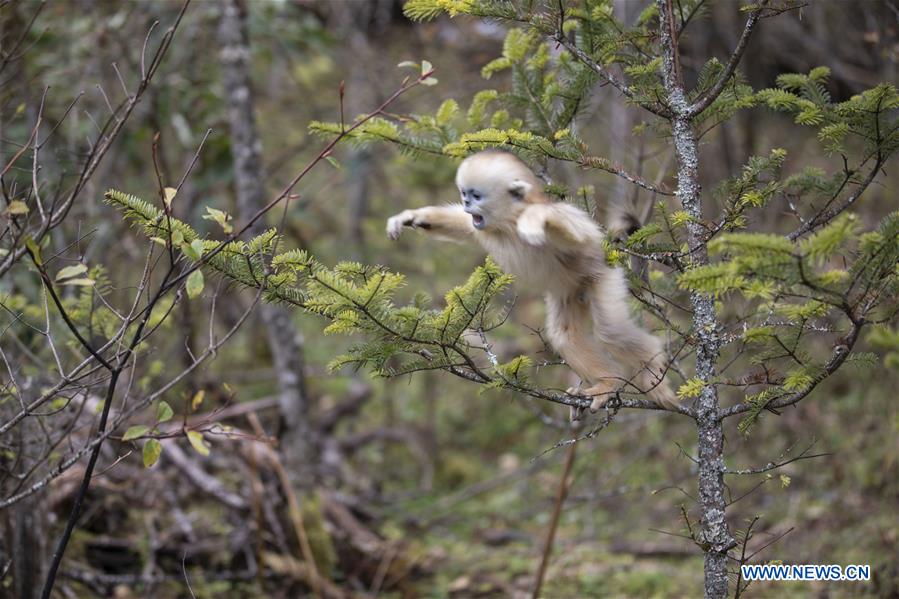 Un singe doré au Centre de recherches sur les singes dorés de Dalongtan dans le Parc national de Shennongjia de la province du Hubei (centre de la Chine), le 11 octobre 2020. Grâce aux efforts des autorités locales et à l'amélioration de l'environnement, le nombre de singes dorés à Shennongjia a atteint près de 1 500 aujourd'hui. (Xinhua/Wang Siban)
