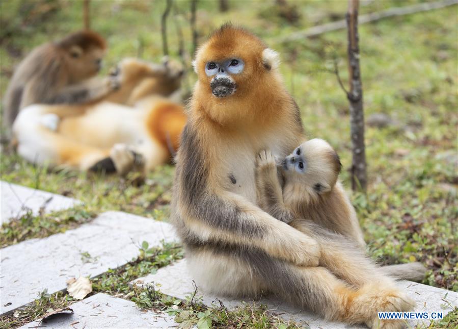 Des singes dorés au Centre de recherches sur les singes dorés de Dalongtan dans le Parc national de Shennongjia de la province du Hubei (centre de la Chine), le 11 octobre 2020. Grâce aux efforts des autorités locales et à l'amélioration de l'environnement, le nombre de singes dorés à Shennongjia a atteint près de 1 500 aujourd'hui. (Xinhua/Wang Siban)