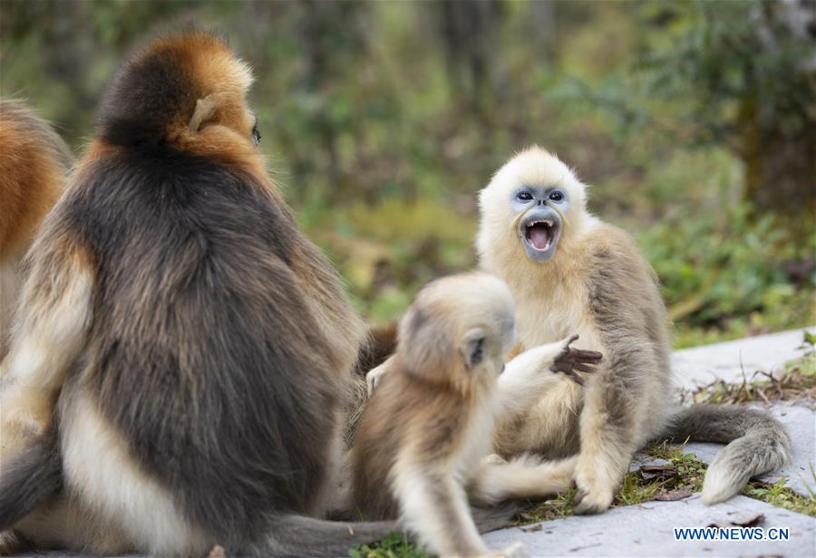 Des singes dorés au Centre de recherches sur les singes dorés de Dalongtan dans le Parc national de Shennongjia de la province du Hubei (centre de la Chine), le 11 octobre 2020. Grâce aux efforts des autorités locales et à l'amélioration de l'environnement, le nombre de singes dorés à Shennongjia a atteint près de 1 500 aujourd'hui. (Xinhua/Wang Siban)